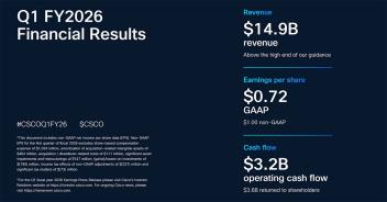 Cisco has reported first quarter results for the period ended October 25, 2025. Cisco reported first quarter revenue of $14.9 billion, net income on a generally accepted accounting principles (GAAP) basis of $2.9 billion or $0.72 per share, and non-GAAP net income of $4.0 billion or $1.00 per share.