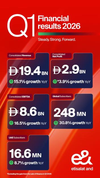 Abu Dhabi, 28 April 2026 – e& reported a strong start to 2026, with robust Q1 financial results, asserting the Group's leadership in shaping the digital landscape and consolidating its position as a leading global group.
